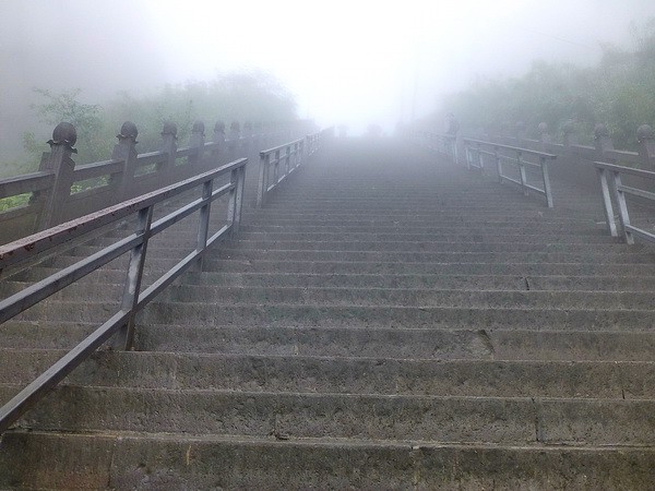 По краям лестницы в тумане разглядывали цветущие растения, был слышен шум водопада.