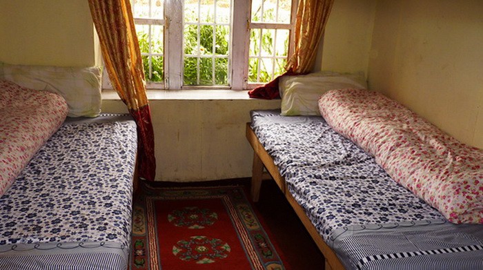 Чистая и уютная комната. Тёплые одеяла на кроватях. Естественно, не отапливается. Пока светло, не холодно. Ночью -дубарь. Туалет на улице. Крана с холодной водой просто нет. Умываемся с тазика. Расселяемся, пьём по стакану горячего молока яка и идём на прогулку по селению.