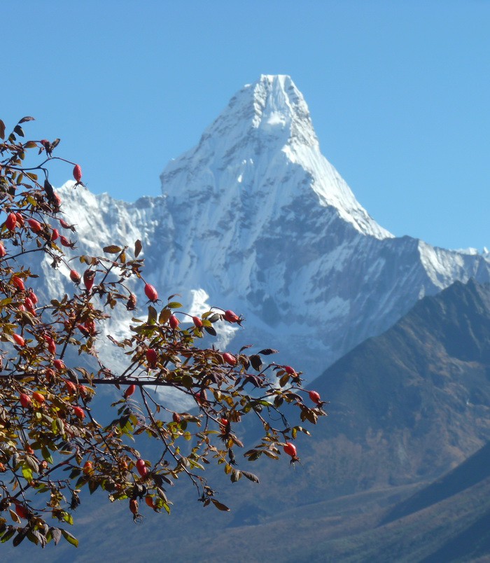 Нам улыбается красавица вершина Ама-Даблам (6812 м). В этом месте мы обнаружили большие заросли шиповника и набрали ягод для чая. Но когда показали его нашему гиду, он сказал. что их не собирают и не едят.