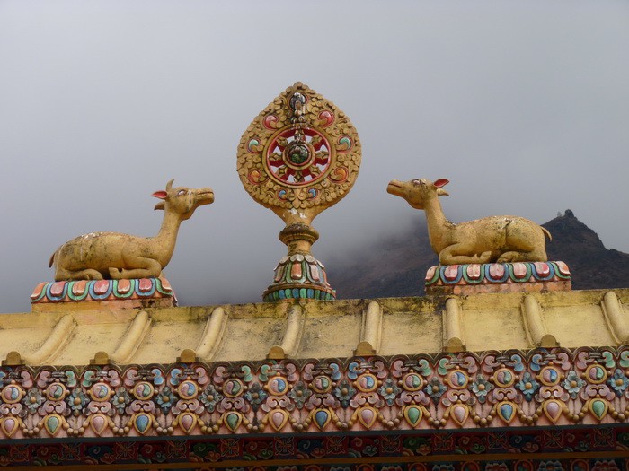 Идём среди множества маленьких полей, обнесённых высокими каменными заборами. Кругом бродят яки, коровы, дзо, бегают собаки. Вдалеке показался буддийский монастырь Khunde.