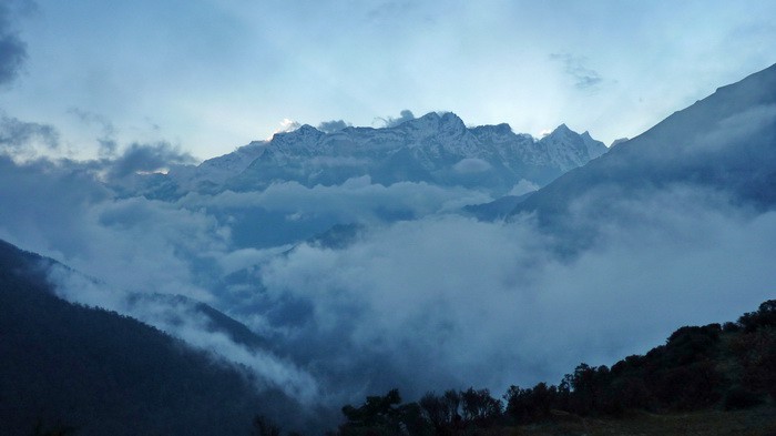 Около часа мы ходили по этой поляне, ошалелые от увиденного, фотографирую и снимая на видео всё подряд по нескольку раз. Пора было возвращаться в нашу лоджию, перекусить и двигать дальше. Следующим на нашем треке было селение Кумжунг. К нему вёл затяжной подъём, с которого мы любовались ещё одной горой.