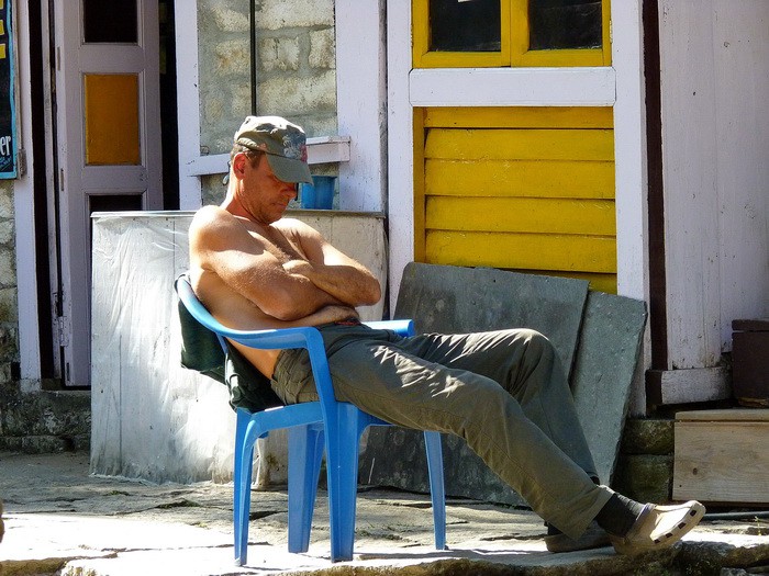 мы сворачиваем с основной тропы и уходим вниз к реке. Над нами часто пролетают самолёты и вертолёты в Луклу и обратно.