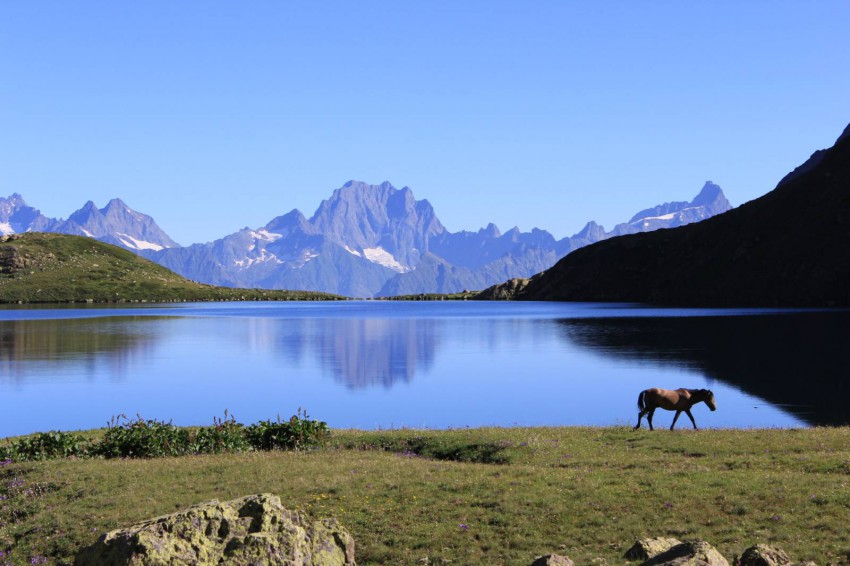 Озеро Адуада-Адзыш считается красивейшим озером Кавказа. В его прозрачной голубой воде в тихую погоду отражаются зазубренные горные вершины.