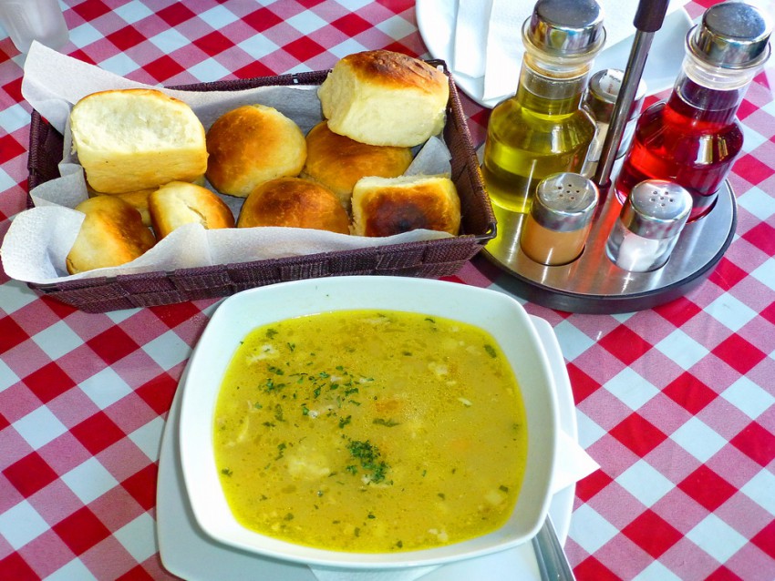 Не далеко от дома увидели кафе, где уже обедали несколько человек. Зашли и заказали куринную чорбу. Как всегда в Черногории, чорба была с кусочками мяса. Тарелка супа стоила 2 евро. Хлеб подали горячим. Всё было очень вкусным и ароматным.