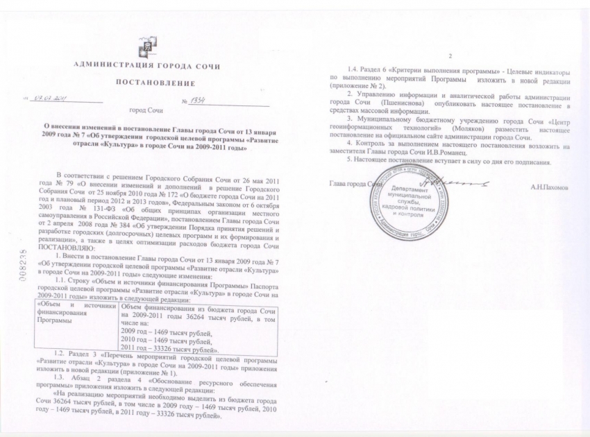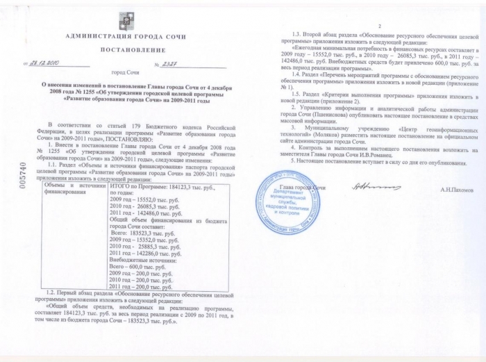 В постановлении № 2403 от 31.12.2010г «О внесении изменений и дополнений в постановление Главы города Сочи от 12 ноября 2008 года №1222 «Об утверждении городской целевой программы «Информирование населения о деятельности органов местного самоуправления муниципального образования город-курорт Сочи» на 2009-2011 годы» отсутствуют приложения…