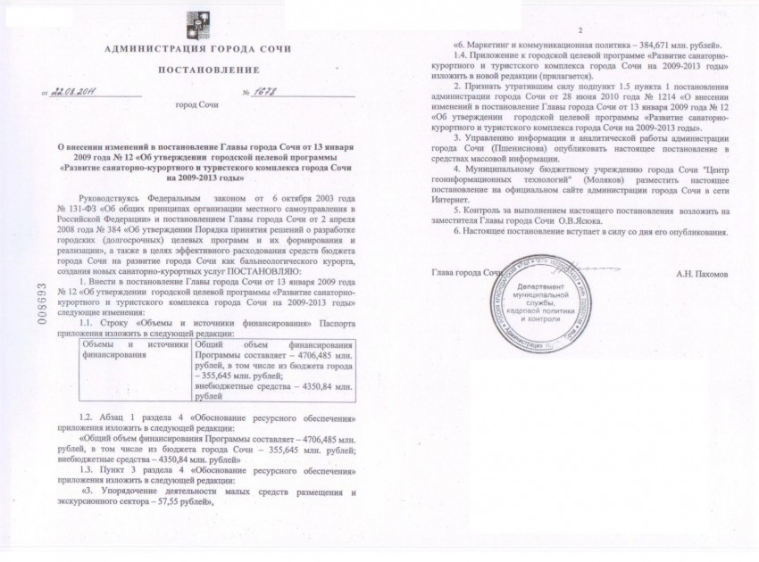 Из отчёта Главы города Сочи Пахомова А.Н «Об итогах социально-экономического развития муниципального образования город-курорт Сочи в 2010 году и перспективах развития на 2011 год.»: