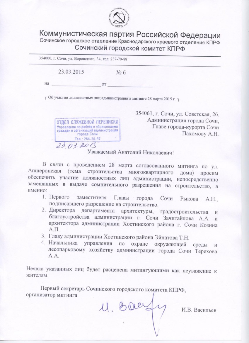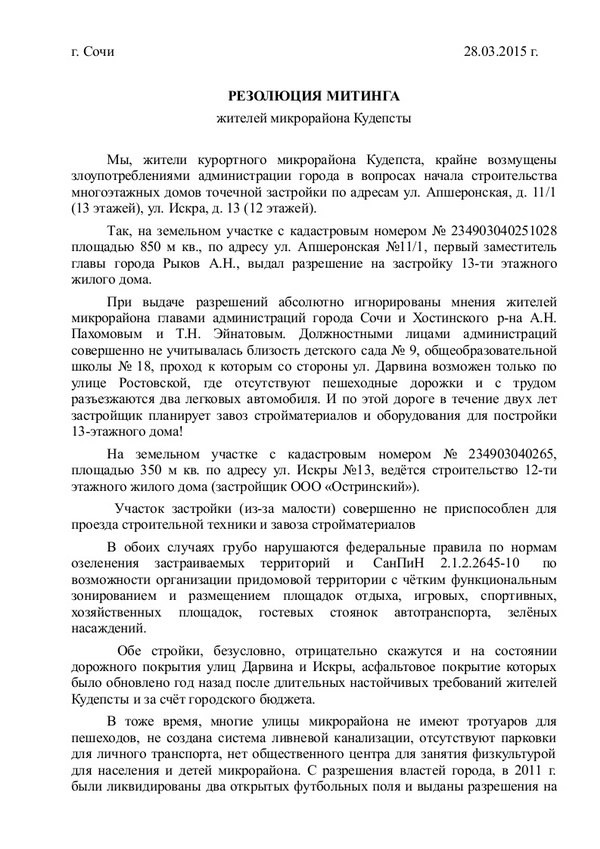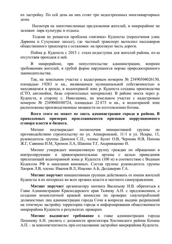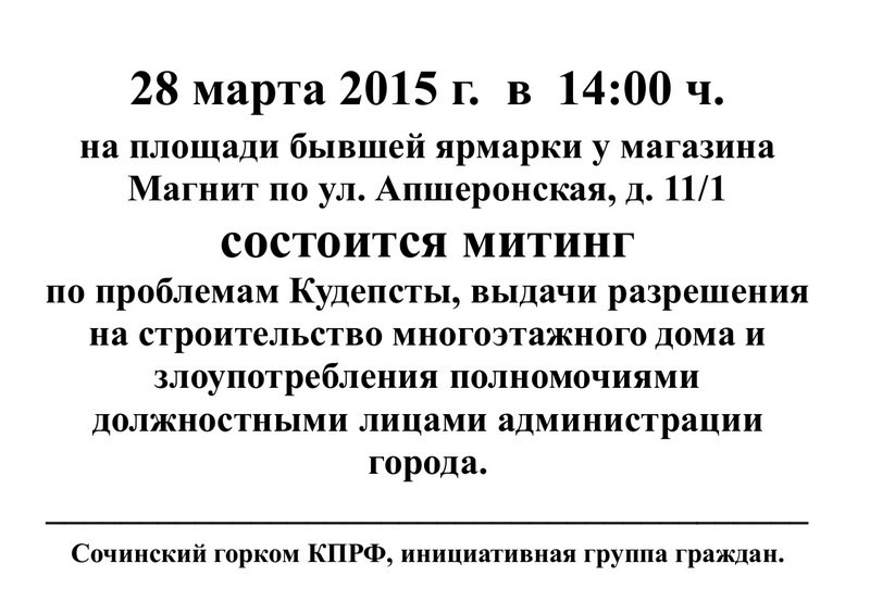 Создав инициативную группу, жители Кудепсты решили провести митинг протеста с приглашением чиновников городской администрации и местных депутатов. Это решение граждан поддержало городское отделение КПРФ. Уведомление в городскую администрацию подано, возражений не последовало. Письма-приглашения направлены на имя главы Сочи А.Н. Пахомова и председателя ГСС А.Н. Луцыка.