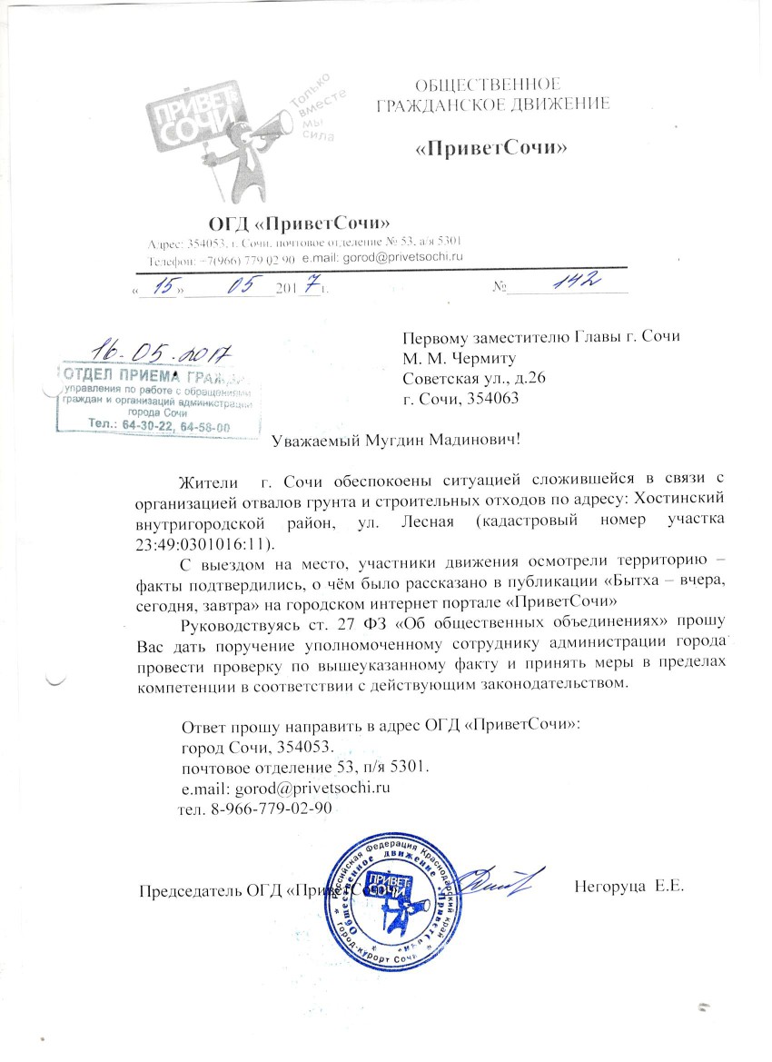 Наш вопрос не личного характера, а имеет большую общественную значимость, т.к. затрагивает интересы большого микрорайона Бытха, в котором проживает около 30 тысяч жителей. И не решается он, т.к. муниципальные чиновники, призванные защищать интересы населения города и получают за это зарплату, на самом деле действуют против интересов жителей и даже не стесняются этого, а открыто выступают на стороне лиц, пытающихся что-то незаконно урвать, присвоить, навредить. Особенно способствуют чиновники незаконным застройщикам, выдают им договора аренды на земельные участки, непригодные для строительства в ущерб другим сооружениям.