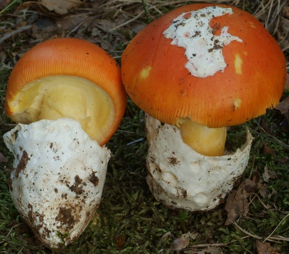 Еще Цезарь ел мухоморы — Цезарский гриб (Amanita caesarea) — Шляпка диаметром 6-20 см, яйцеобразная, полусферическая, затем выпукло-распростёртая, оранжевая или огненно-красная, с возрастом или увяданием желтеющая, голая, реже с крупными белыми остатками общего покрывала, с рубчатым краем.