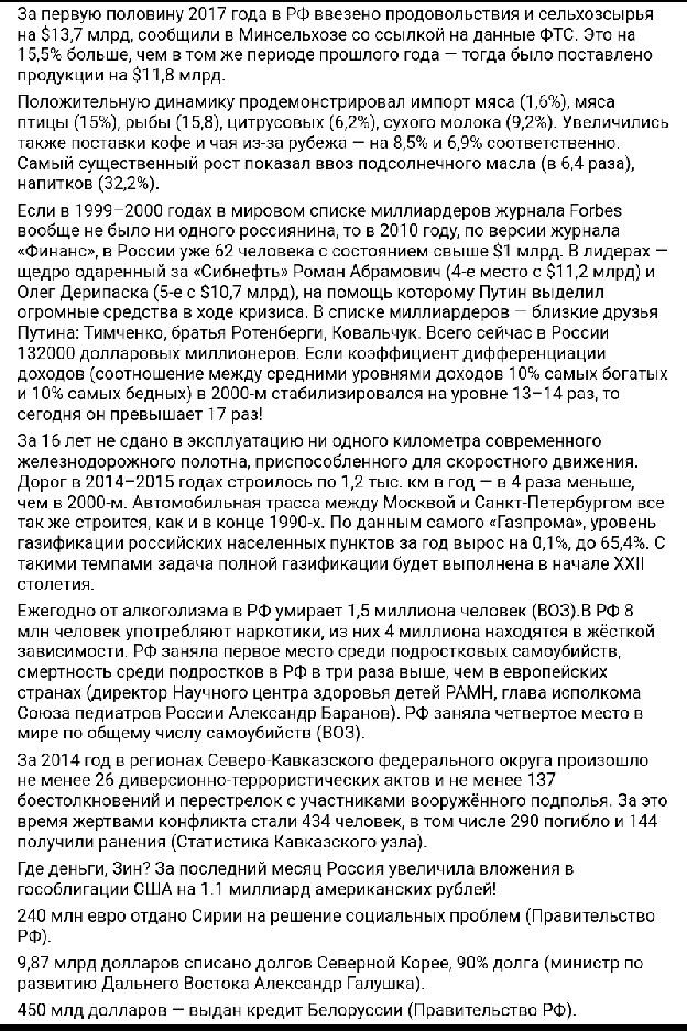 Так что за исключением пятой колонны, воров бизнесменов, ограбивших страну на триллионы, и жалких фарцовщиков вроде тебя — народу не нужна такая криминальная Россия, какой она стала за последние четверть века, и при возможности избавления от криминала и внешнего наглого давления всяких америкосов и англикосов — социализм вернется в том или ином виде, пути иного у человечества нет: либо социализм, либо вечные войны до полного самоуничтожения цивилизации.