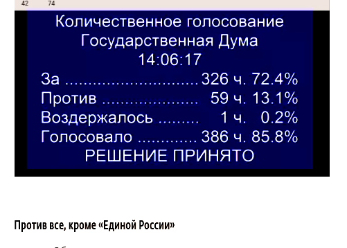 Алферов случайно уронил бутылку с водой на кнопку голосования, поэтому вышло не по его желанию. Даже ЕР-овцы частично уклонились от участия в голосовании, а Поклонская опять голосовала против реформы