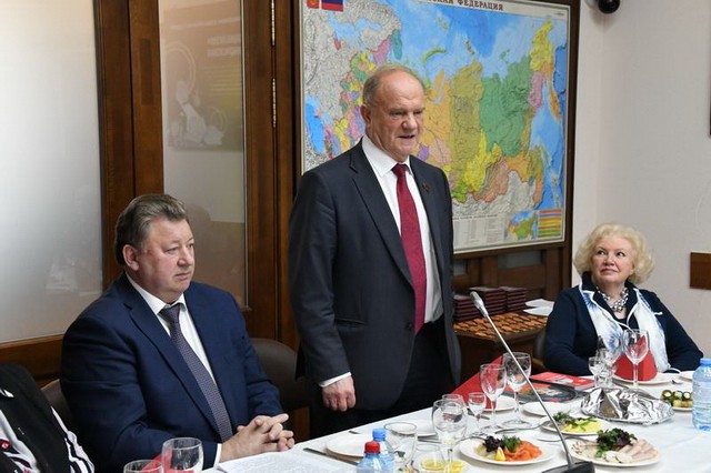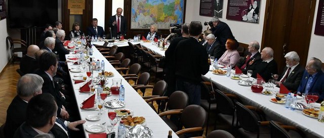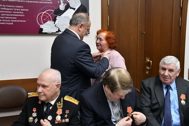 Г.А. Зюганов награждает памятной медалью ЦК КПРФ ветеранов космонавтики и космической отрасли. 11 апреля 2019 г., помещение ЦК КПРФ.