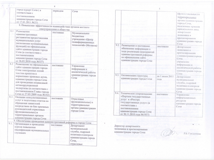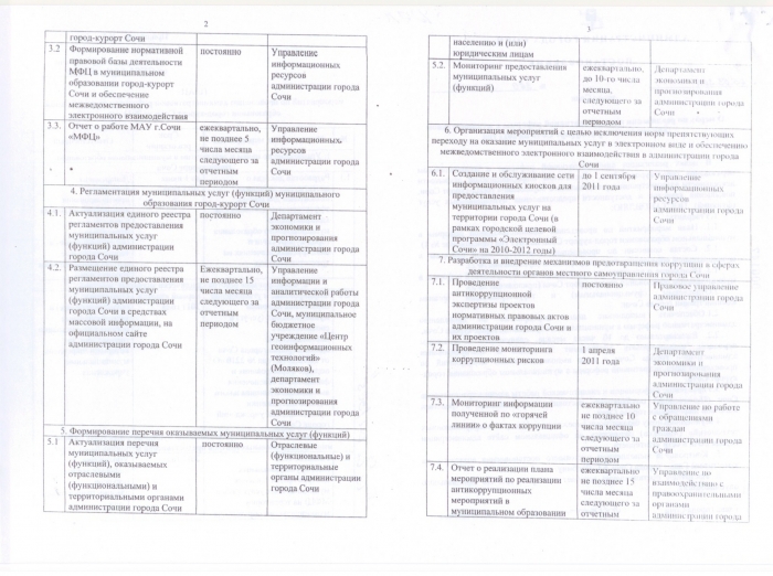 а вот здесь не знаю… например, «Оптимизация структуры администрации г. Сочи » до 01 июня 2011г… Учитывая, что эти все мероприятия на 2011год… То пока предложения внесут, пока рассмотрят… Год прошёл. Наверное, эта реформа задумывалась не вчера. Можно было ещё в прошлом году рассмотреть оптимизацию, хотя оптимизировать можно и увеличивая количество чиновников…