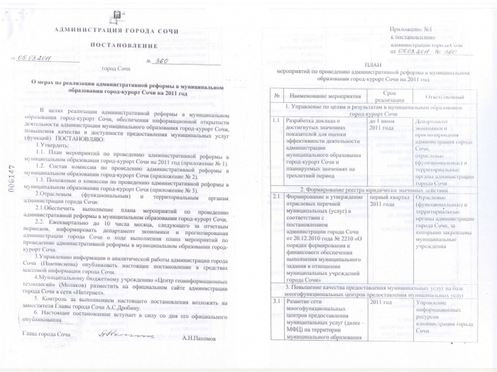Постановление администрации города Сочи № 360 от 05.03.2011 г. «О мерах по реализации административной реформы в муниципальном образовании город-курорт Сочи на 2011 год»