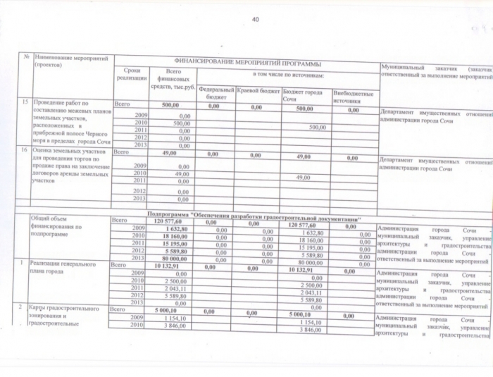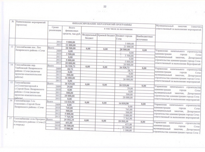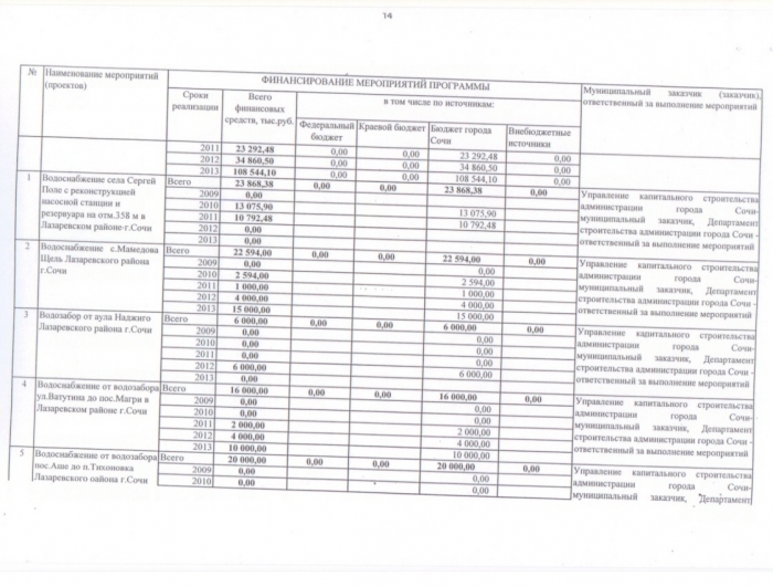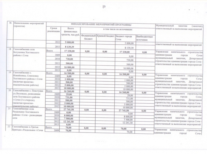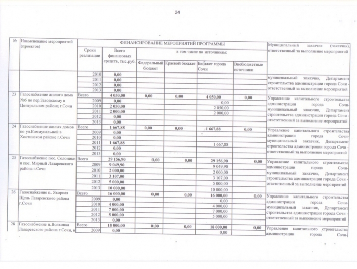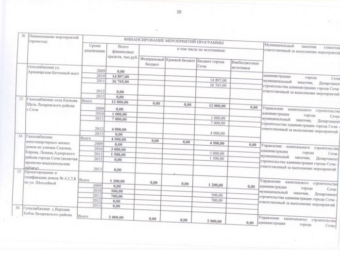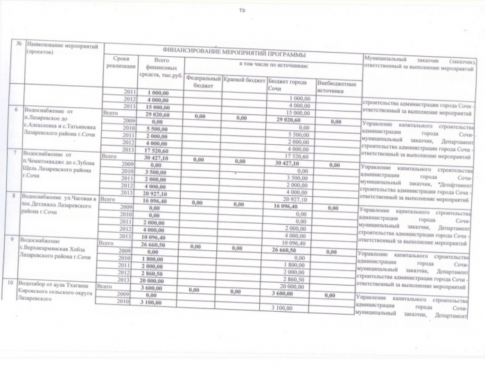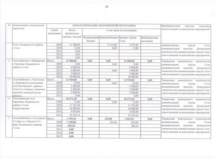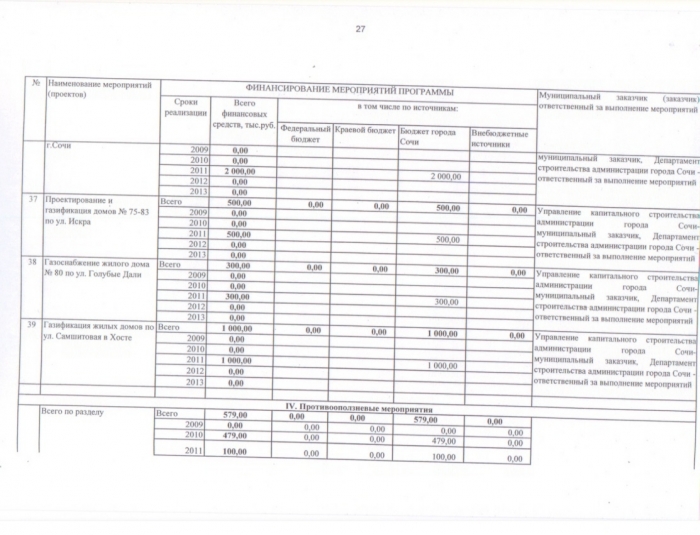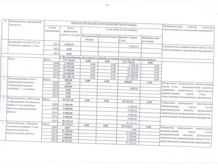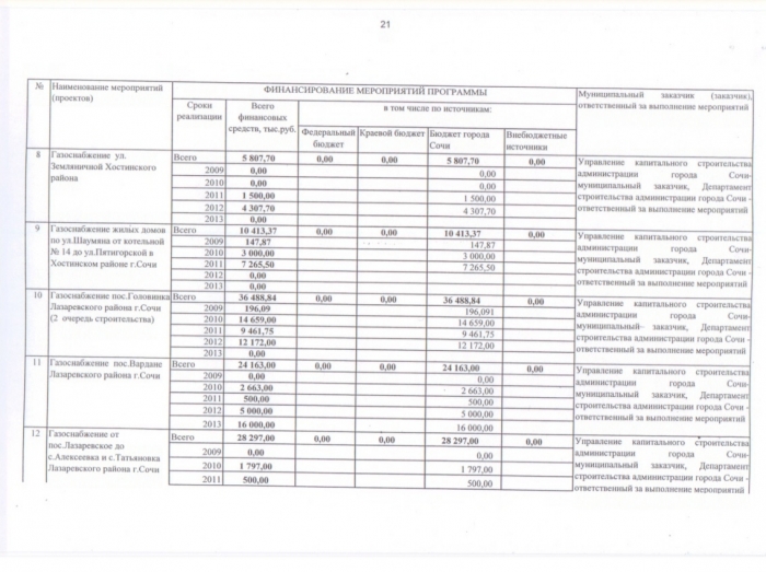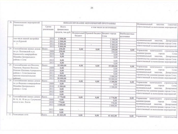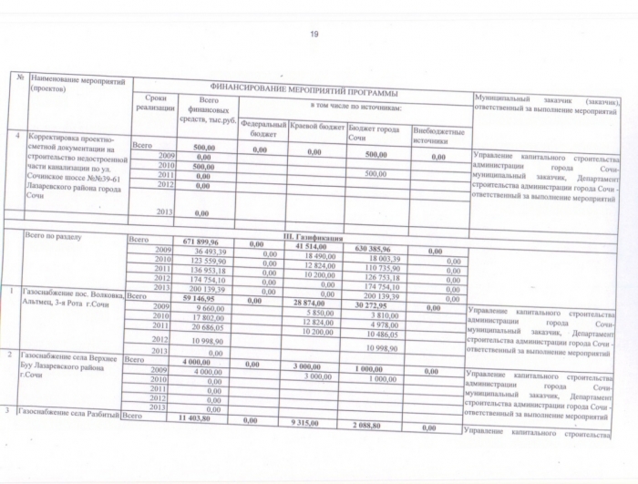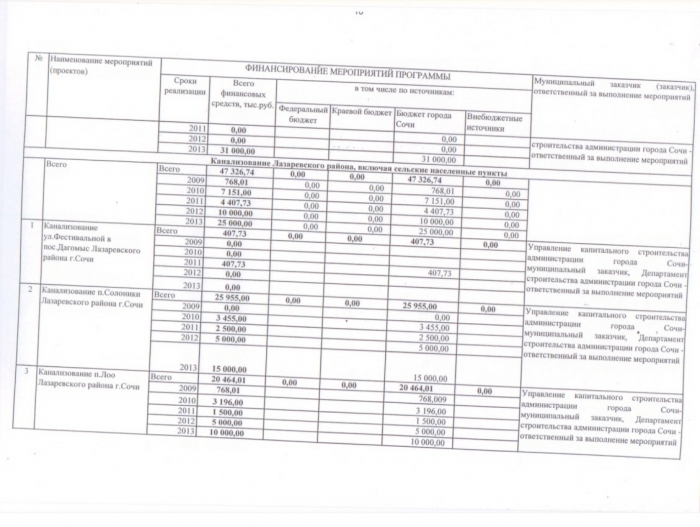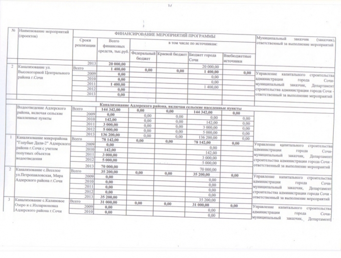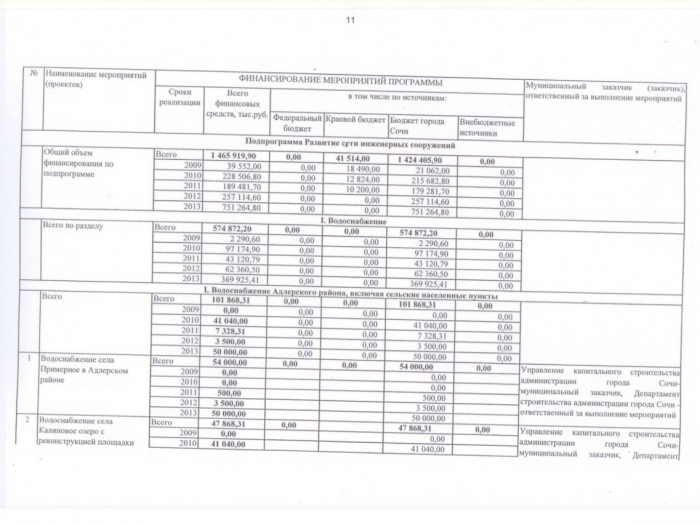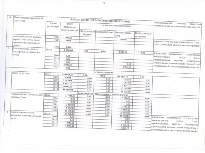 По городской программе «Социально-экономического развития города Сочи на 2009-2013 годы» за счет средств городского бюджета были выполнены работы по проектированию и строительству инженерных сетей внутригородских и сельских округов города Сочи на общую сумму 147 миллионов рублей.А даже по этой самой урезанной в апреле 2011года программе за два года 2009 и 2010 должны были выполнить работ на 268 058,80 тыс.руб, т.е. меньше на 121 058,80тыс.руб или на 45%.