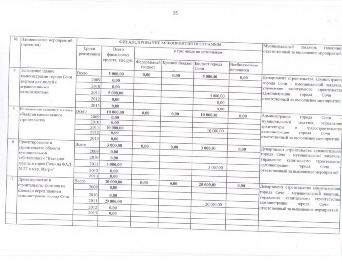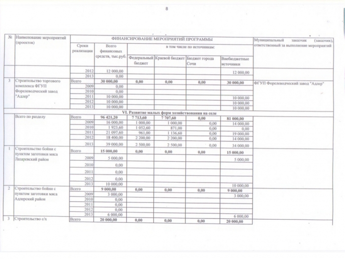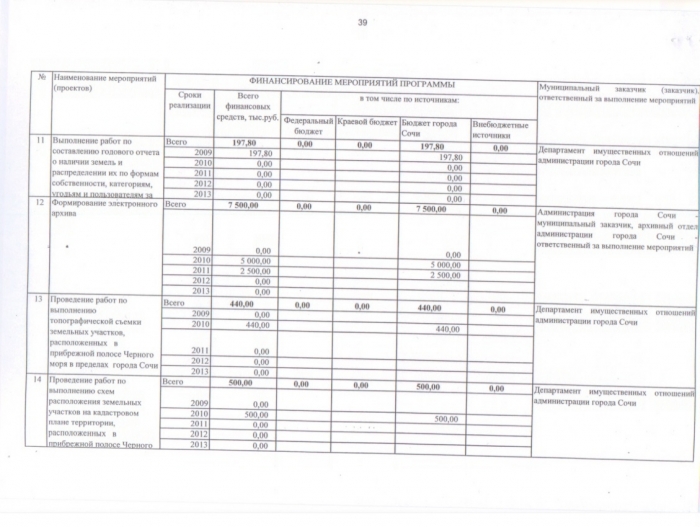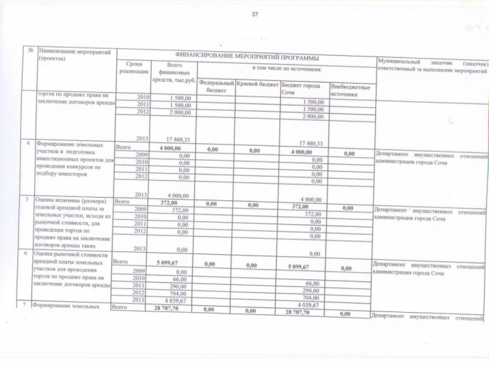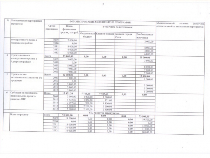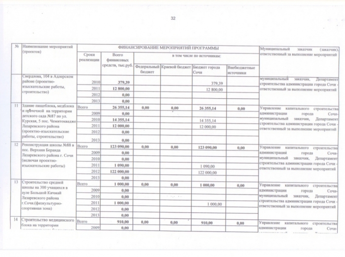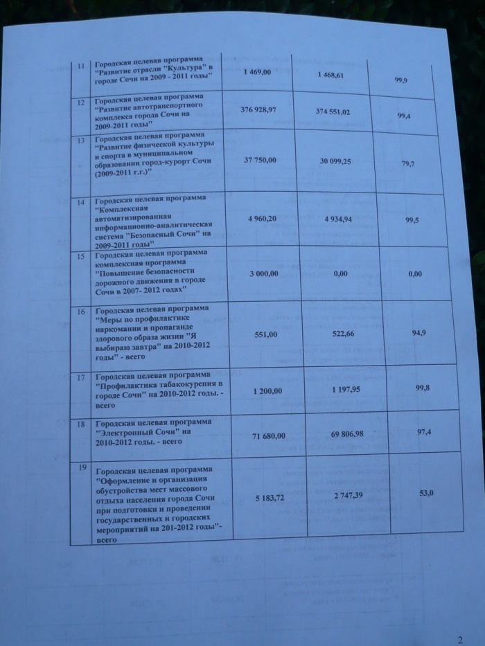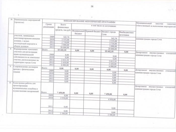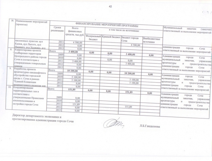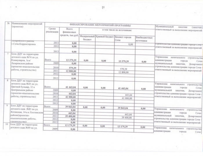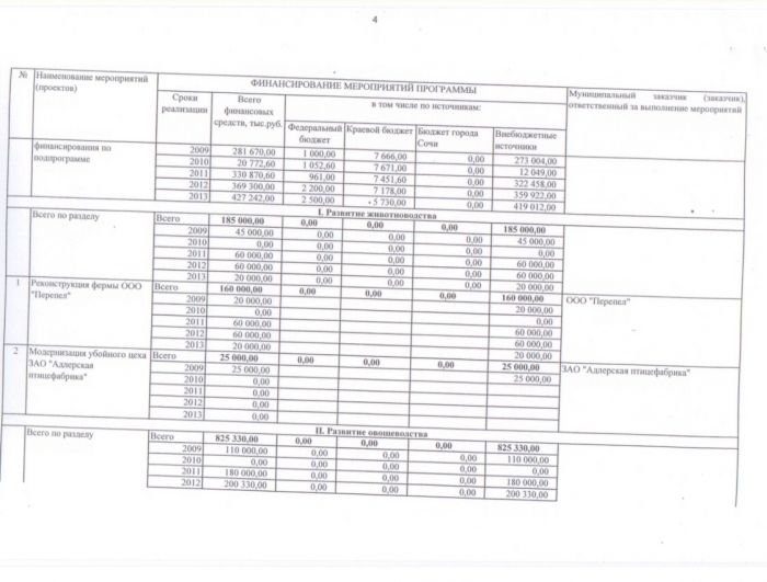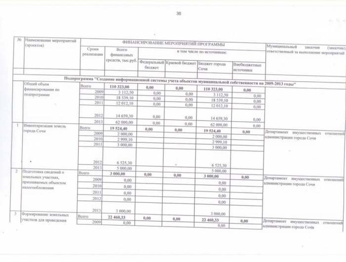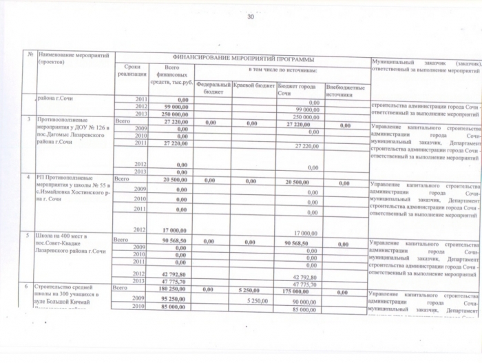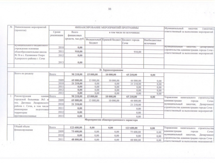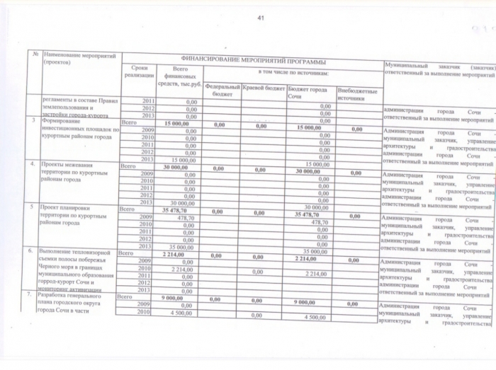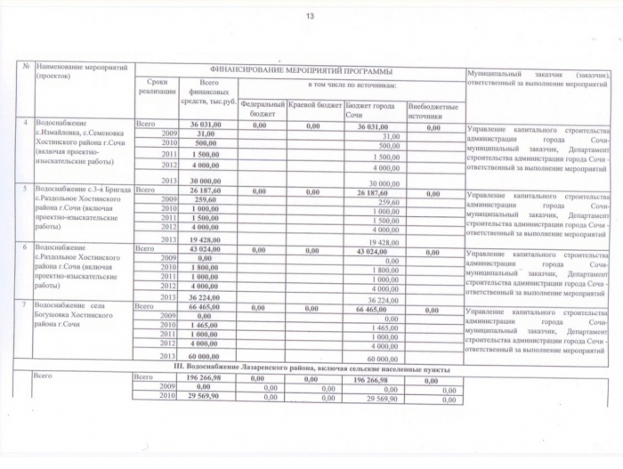По городской программе «Социально-экономического развития города Сочи на 2009-2013 годы» за счет средств городского бюджета были выполнены работы по проектированию и строительству инженерных сетей внутригородских и сельских округов города Сочи на общую сумму 147 миллионов рублей.А даже по этой самой урезанной в апреле 2011года программе за два года 2009 и 2010 должны были выполнить работ на 268 058,80 тыс.руб, т.е. меньше на 121 058,80тыс.руб или на 45%.