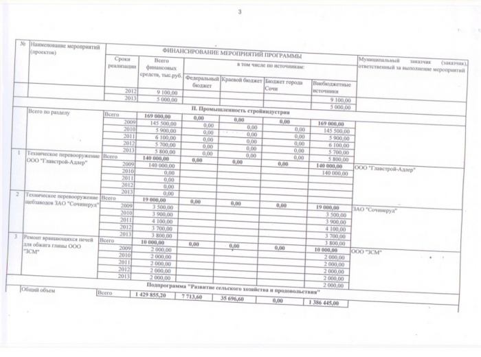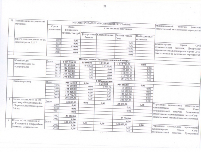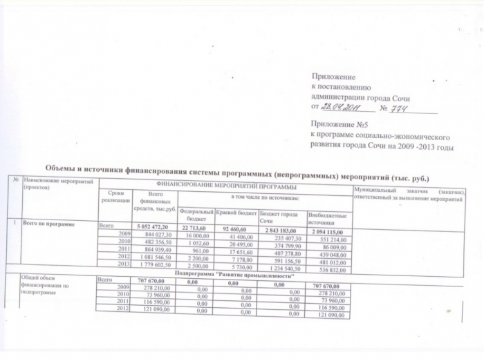 Программа социально-экономического развития города Сочи на 2009-2013 годы утверждена постановлением Главы города № 43 от 02.02.2009г и откорректирована постановлением № 238 от 15.07.09г. Весь сравнительный анализ выполнения программы сделан по соотношению данных этого постановления и последнего — № 774 от 28.04.2011г.