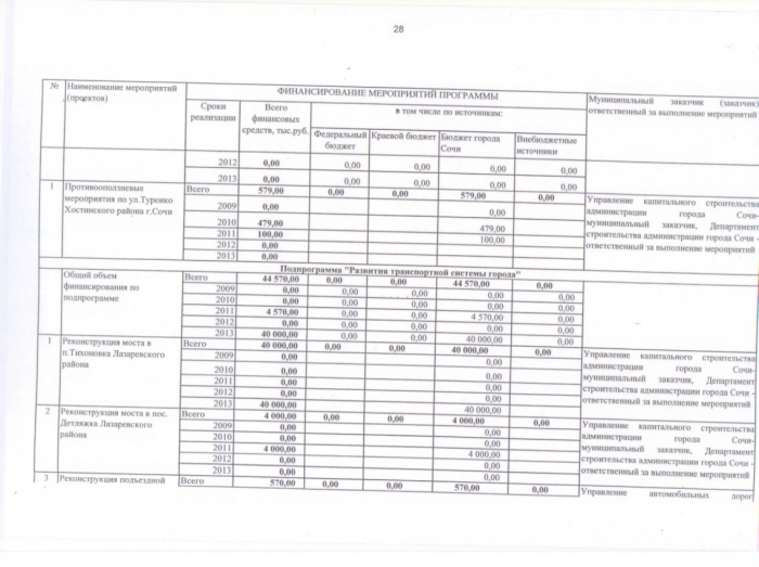 На подпрограмму «Развитие транспортной системы города» закладывалась сумма 168 123,14 тыс.руб, из них мост в п. Тихоновка — 40 000,00тыс.руб, мост ч/з реку Мацеста 34 766,00тыс.руб, мост в с.Волковка — 53 357,14 тыс.руб и автодорожный мост ч/з реку Сочи в районе школы № 44 — 40 000,00 тыс.руб, из всего это практически ничего не осталось..Сокращение составило 75%…