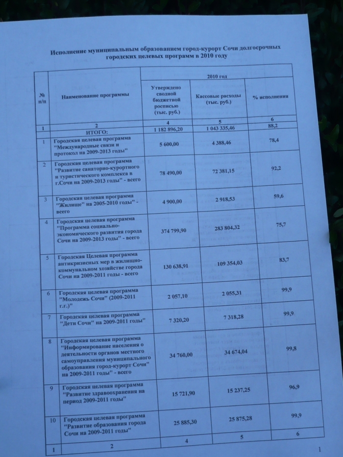 Об итогах социально-экономического развития муниципального образования город-курорт Сочи в 2010 году и перспективах развития на 2011 год.сделанного им на открытой сессии Городского Собрания Сочи в марте 2011г… в городе всё настолько отлично, что ни в сказке сказать, ни пером описать… Не буду вас мучить пересказом победной реляции нашего мэра, цифры впечатляют. Опять смешались в кучу — и олимпийские объекты, и, собственно объекты, которые должны были быть построены согласно данной программы, касающейся каждого жителя Большого Сочи от Магри до Весёлого. Поэтому я предлагаю вам внимательно ознакомиться с каждым положением программы, возможно, вы найдёте для себя кое-что очень интересное…