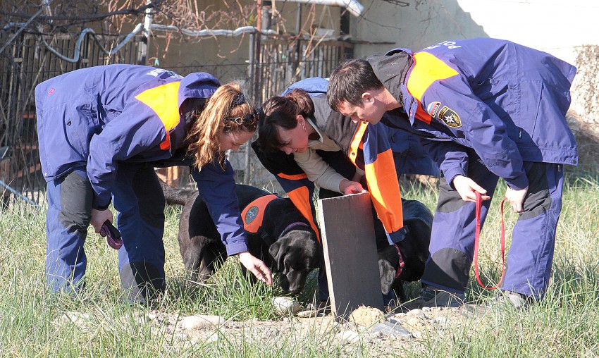 Кинологический расчет также выполнит поиск условно пострадавшего. По легенде в результате землетрясения образовался завал из плит, под ними находится пострадавший. К месту ЧС прибывает аварийно-спасательный автомобиль с группой спасателей, медиков и кинологических расчетов. Спасатели разворачивают оборудование, кинологи обследуют завал.