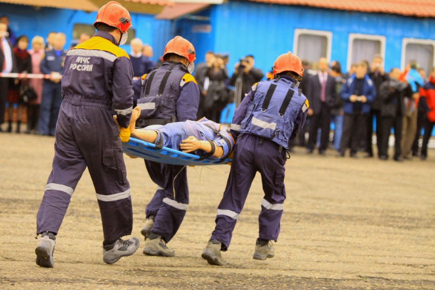 В рамках показательной тренировки спасатели отработают деблокирование условно пострадавшего из автомобиля, его транспортировку в носилках в мобильный медицинский госпиталь.