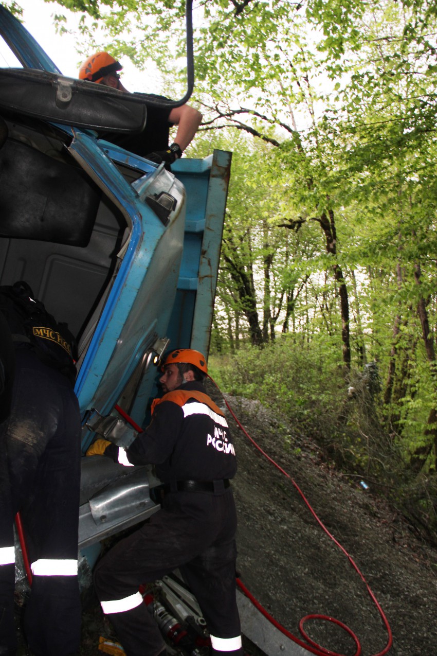 27 апреля около 18.00 в МЧС позвонил мужчина и сообщил, что на горном серпантине неподалеку от поворота на Чертовы ворота произошла авария – груженый щебнем большегруз перевернулся на бок. Сами очевидцы не смогли помочь водителю выбраться, потому что его зажало в кабине.