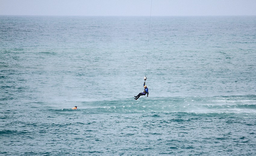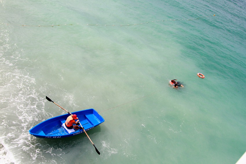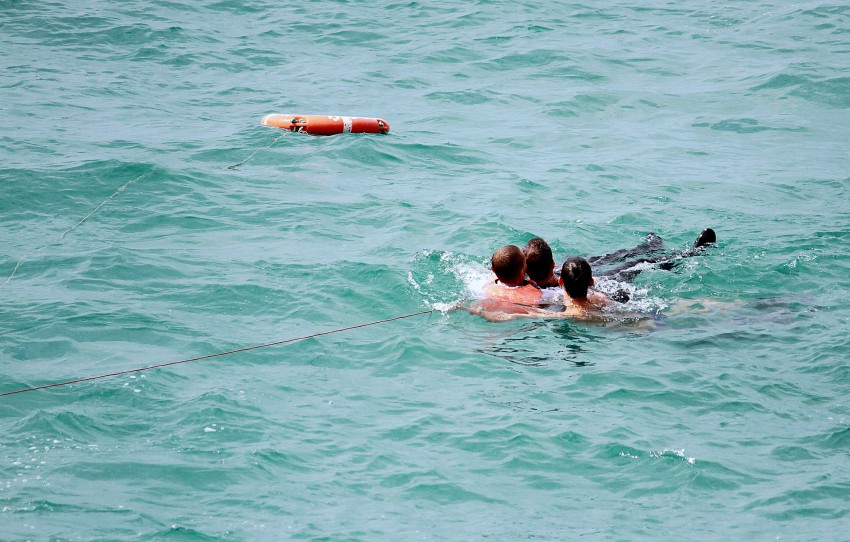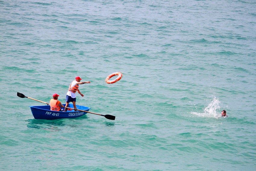 При обнаружении первого пострадавшего, спасатель кидает ему круг и отправляется на поиск остальных.