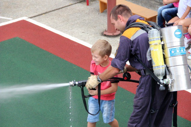 Готовясь к приезду спасателей, детки с нетерпением ждали, когда сотрудники МЧС начнут показывать аварийно-спасательные инструменты и у них появится возможность самим попробовать «тушить пожар», под контролем взрослых гидравликой раскусывать железные конструкции, и, конечно же, поиграть с дружелюбным четвероногим спасателем – лабрадором по кличке Гера.