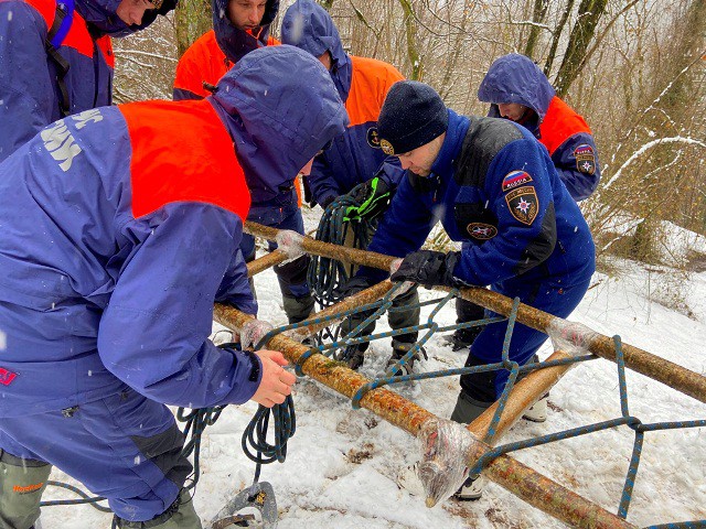 В заключительный день тренировочного выхода спасатели ЮРПСО МЧС России отрабатывали транспортировку живого «пострадавшего» с применением носилок. Вязали их из подручных средств – ветки деревьев связывали веревками, сверху клали коврик. Эвакуировали человека от поселка Ажек около километра по снегу. Со всеми поставленными задачами спасатели справились на отлично.