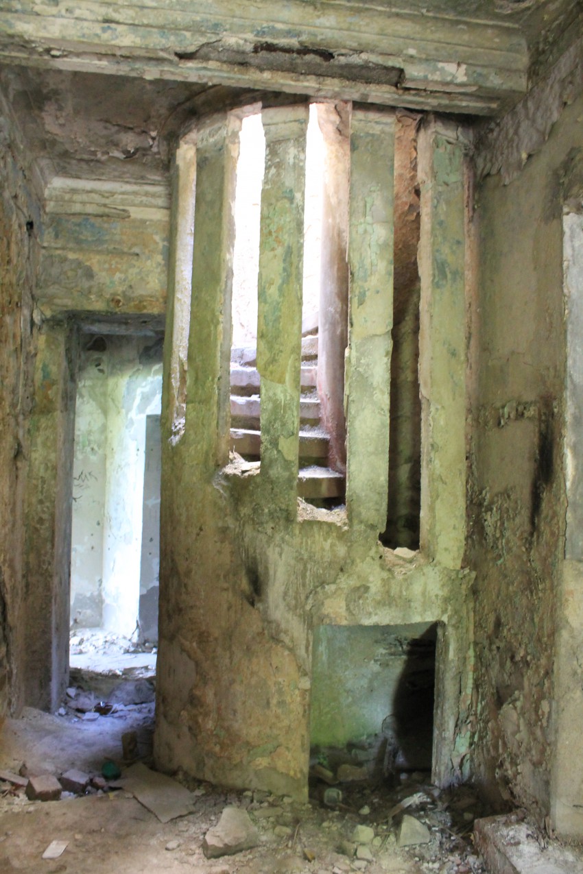 Территория дома отдыха заросла травой и колючкой, по старой лестнице спускаемся к замку.