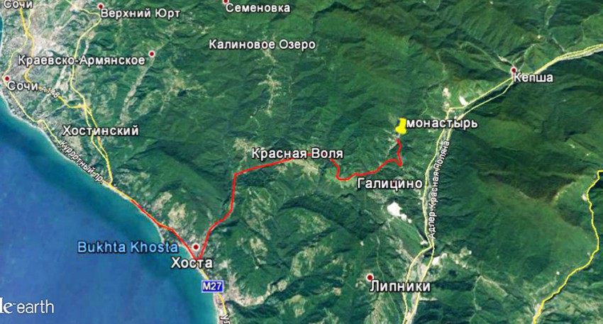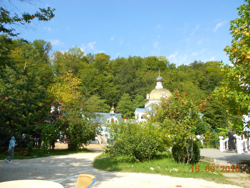 Так как это была ночь и темно, было много машин, много людей, кто-то только ехал, чтобы окунуться, а кто-то уже возвращался очищенным и счастливым. Но несмотря на такой поток людей в этом месте чувствуется невероятное умиротворение! Поставив машину на обочине (Слава Богу казачья служба при Администрации города Сочи работала очень хорошо и оперативно), мы отправились к монастырю. Фотографии уже нашла в интернете и при дневном свете — это место потрясает ещё больше!!! Так тихо и спокойно в Лесном, мне кажется, и днём и ночью, и летом и зимой. Холмистая местность, сверху видны окрестности и протекающая река Псахо и, конечно же, Троице-Георгиевский женский монастырь. Что же делает место с людьми.