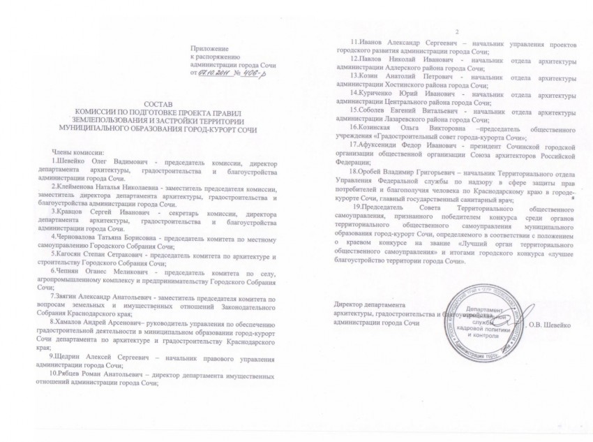 из состава комиссии по подготовке правил землепользования и застройки муниципального образования город-курорт Сочи (ПЗиЗ), которая проводит публичные слушания исключено 6 членов совета общественного учреждения «Градостроительный совет города-курорта Сочи» и вместо них включено-3 чиновника: Шедрин А.С., Рябцев Р.А., Иванов А.С.(номер 9,10,11) и некий Председатель ТОС под номером 19.