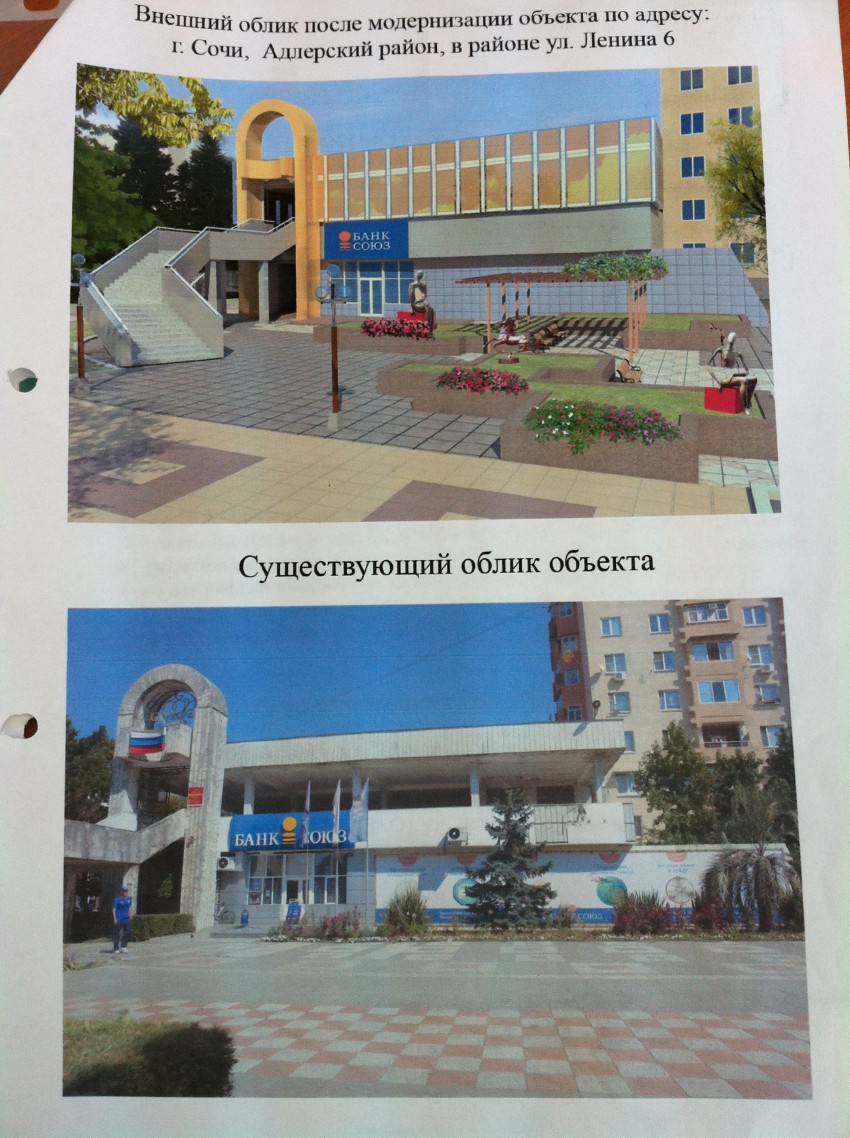 В рамках подготовки к Олимпиаде 2014 года город Сочи должен соответствовать единому архитектурному облику. В зону международного гостеприимства вошли 34 банка по Большому Сочи. По состоянию на 11.04.2013 год привели к требованиям архитектуры 33 банка. Проблема в ОАО «Банк СОЮЗ», расположенный по адресу г.Сочи, ул.Ленина, д.6 на первом этаже. Борьба с руководством продолжается уже 1,5 года. Однако положительной динамики не наблюдается, обещания не оправданы. Последней мерой остается написание протокола об административном правонарушении, который повлечет крупный штраф.