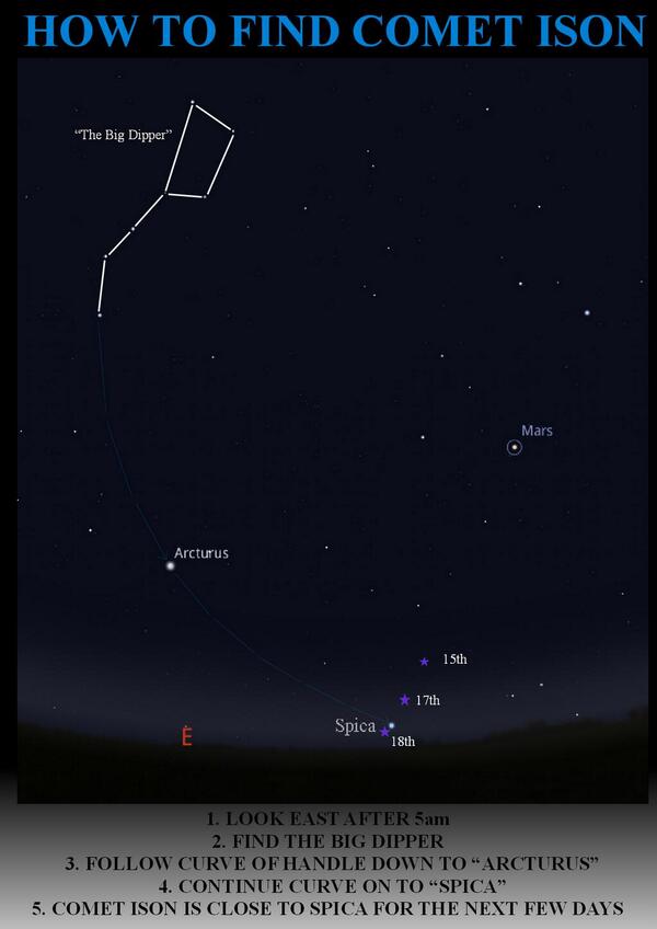 Глядя на изображение кометы, проходящей 4 дня назад возле звезды бета в созвездии Девы, которая на снимке выглядит довольно большим шариком, вы можете видеть насколько она пока тусклая: t.co/JjDh9IRCeQ.