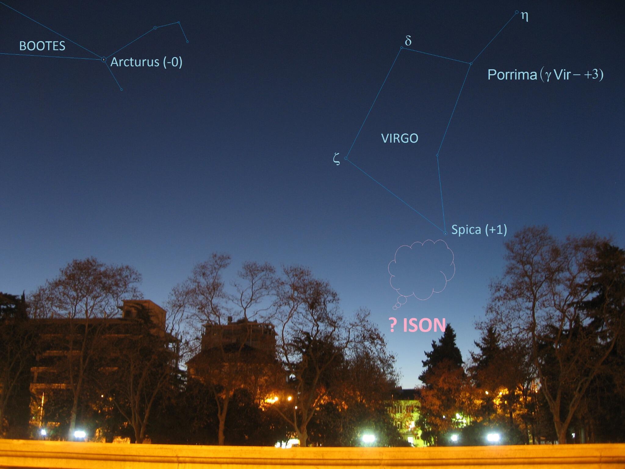 Итак, чтобы предпринять попытку найти ISON, вам надо встать пораньше — в 6-7 часов, что само по себе уже может стать испытанием :) Дальше вам надо посмотреть на Восток и найти Льва и Деву. В этом вам поможет домашний планетарий: www.neave.com/planetarium/
