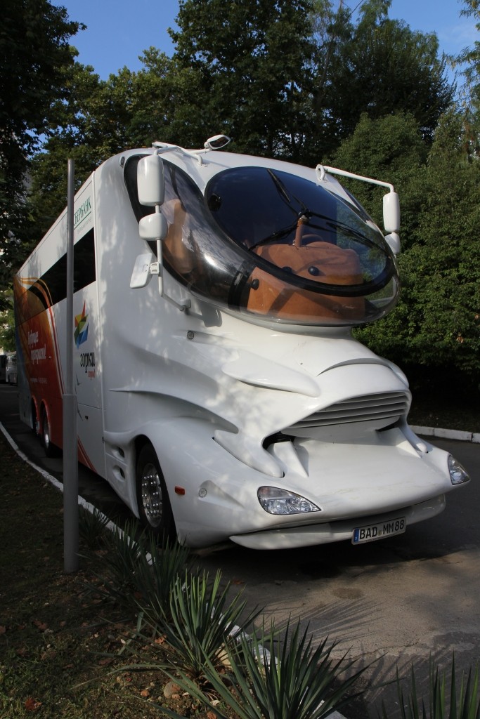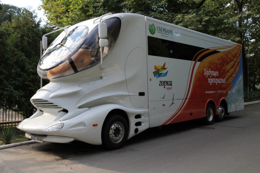 1 автобус — шоурум Сбербанка. Видать на форум прикатил. Этот офис на колесах построен компанией Ketterer на шасси автобуса DAF. Внешний вид автомобиля создал немецкий дизайнер Луиджи Колани, создававший концепт-кары для таких марок, как Porsche, Mercedes-Benz, Ferrari, Ford и Mazda и сотрудничавший с компаниями Alfa Romeo, Lancia, Volkswagen, BMW.