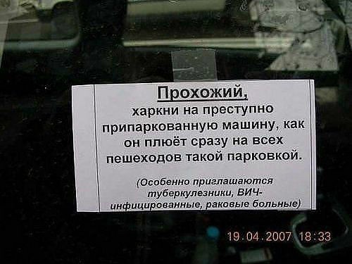 вы чего это так разошлись, любезный? никто тут на камеру не рисуется, просто достали дегенераты, которым говоришь, а они все равно свой тарантас ставят так, что никто пройти не может. если ставить негде, значит ходите пешком, но нечего решать свои проблемы за чужой счет. а с пидрами сами связывайтесь если есть желание.