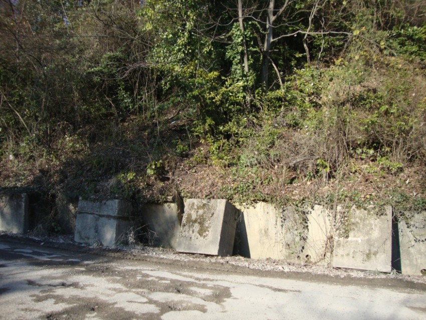 Кроме того, можно увидеть, как уже на старую дорогу сверху ползут деревья, кусты и почва вцелом, и подпирает «это всё дело» — несколько кубиков бетонных.