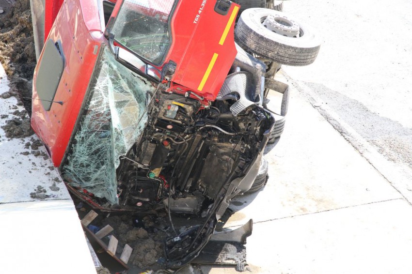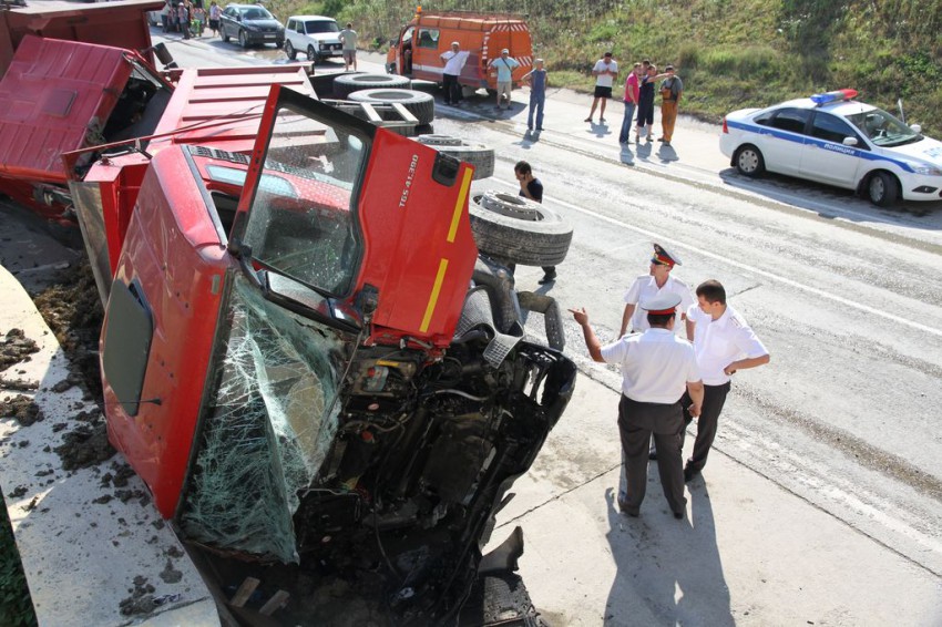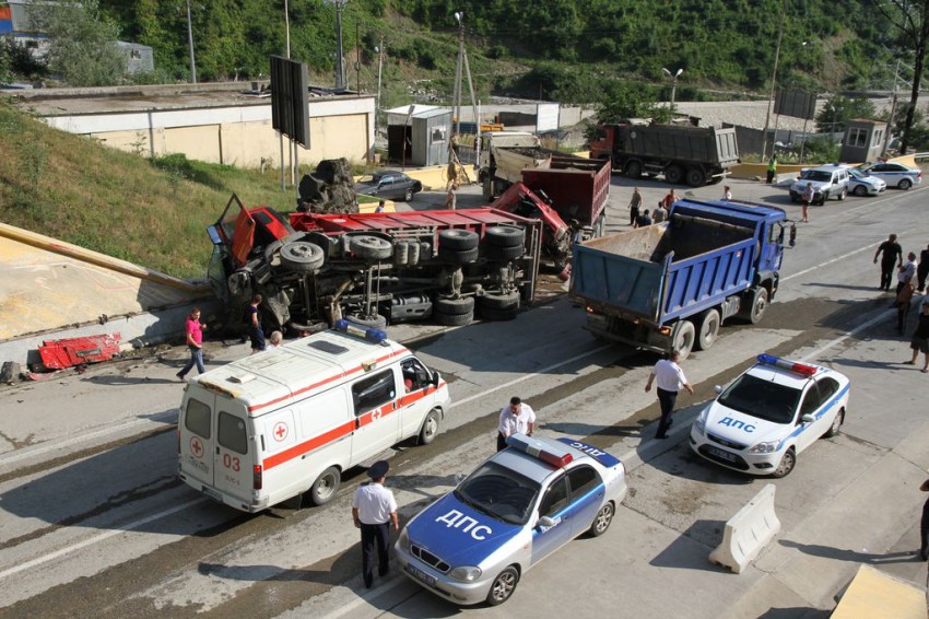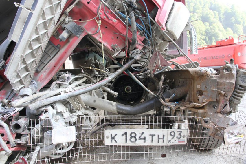 один грузовик, который позади грузовика с грунтом, вообще без двигателя, вроде говорят стоял на обочине и двигатель ранее сняли увезли на ремонт и тут бабах, водителя внутри не было…