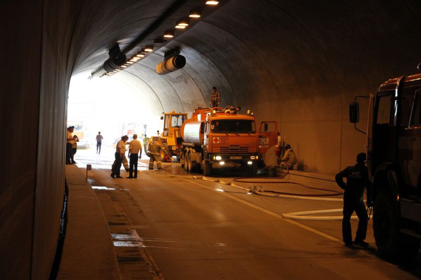По словам очевидцев ( а также и устному частному комментарию представителя службы охраны тоннелей ) — ДТП произошло примерно в 14:30. Мы проехали тоннель в числе первых десяти авто после полного растаскивания и мойки тоннеля в 18:30… так долго «разбирали», потому что с бензовоза солярку откачивали…