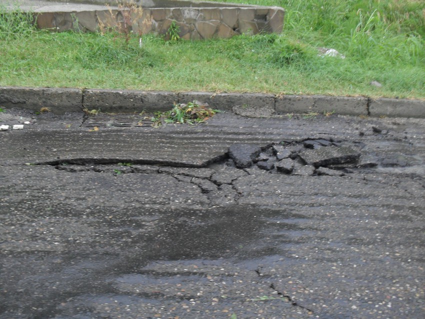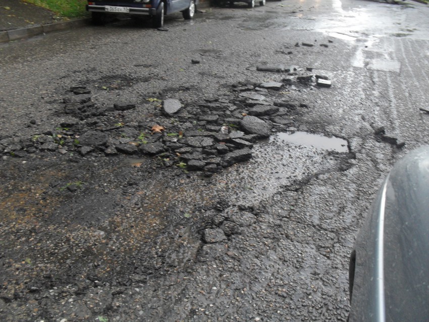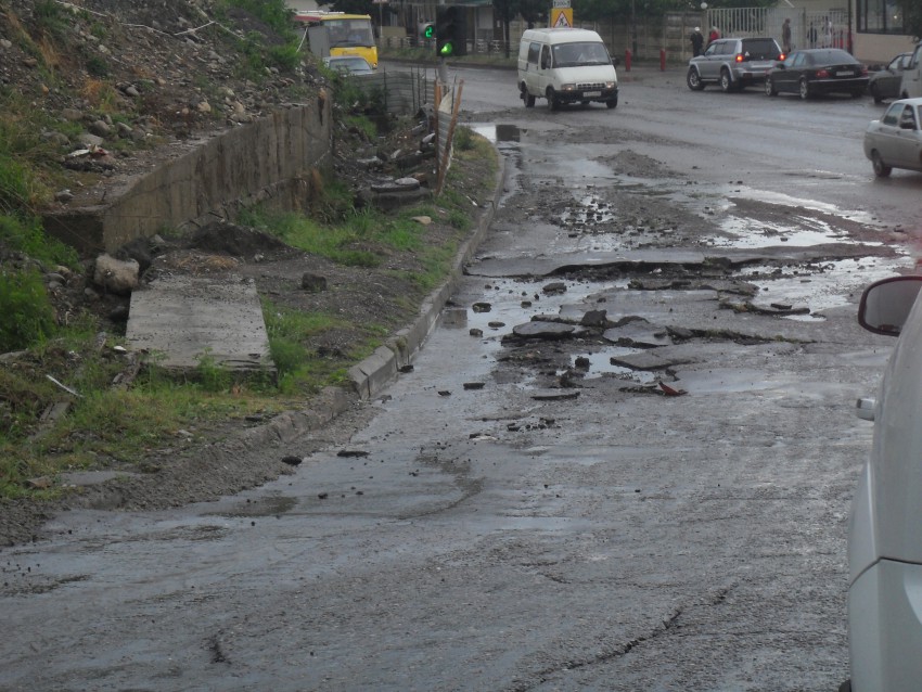 Спуск от ярмарки выходного дня (относительно новый асфальт, нанесенный методом «лепёшечной бомбардировки» на проезжую часть в виде заплаток)