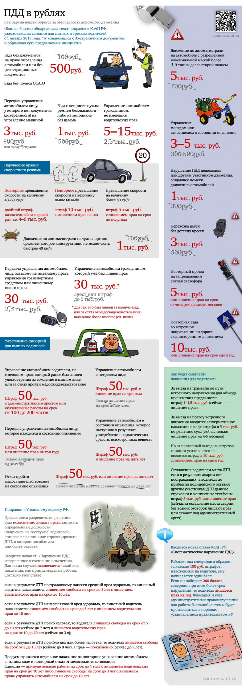 «Единая Россия» обнародовала текст поправок к Кодексу об административных правонарушениях (КоАП) РФ, усиливающих ответственность для пьяных и трезвых водителей с 1 января 2013 года. Таким образом партия власти и ГИБДД отреагировала на страшное ДТП на Минской улице, в ходе которого погибло семь человек. 35-страничный документ затрагивает практически все статьи кодекса, где прописаны санкции за нарушение ПДД. “Ъ” подробно описывает суть предлагаемых инициатив.
