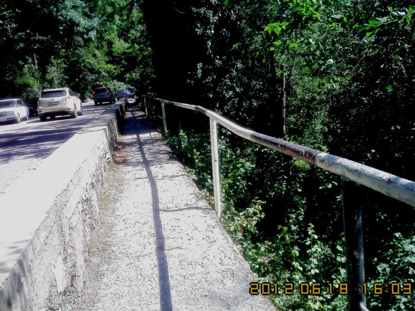 Фото 1. Тротуар с перилами… Перила разрушены-падать вниз более трёх метров… особенно в редкий, но гололёд…