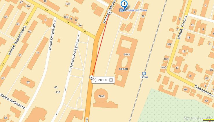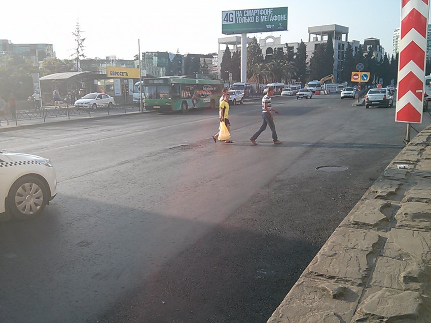 — Да, вы так сможете пройти, там перейдёте через переход раз, потом, поперёк Горького — два, потом ещё один — ул. Роз — три, далее вдоль забора до светофора на Московской, там переход — четыре, и… упрётесь в забор, его надо будет как-то обойти, и вы попадёте на остановку, с которой сможете доехать до Сочи-Магнолия. Но можно и в другую сторону пойти — видите забор (бывшие круглые кассы), до него, потом вдоль него, там будет подземный переход, наполовину перекопаный, там чемодан на колёсиках не проедет, пандусов нет, от туда обратно пройдёте и вы на остановке)))