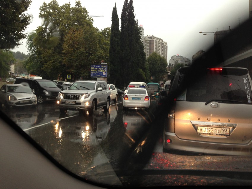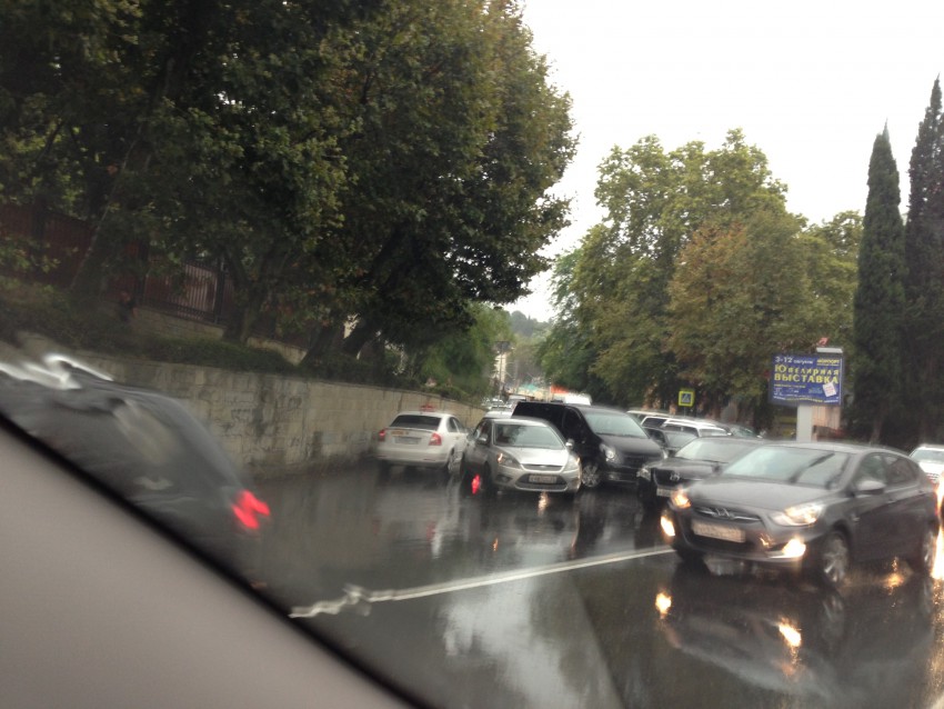 Граждане сочинцы, убедительная просьба, научитесь ездить в дождь из-за вашего тупняка, остальные вынуждены нарушать, что бы не стоять в заторах часами вместе с вами из за того что в дождь у вас какие то проблемы с ездой появляются.