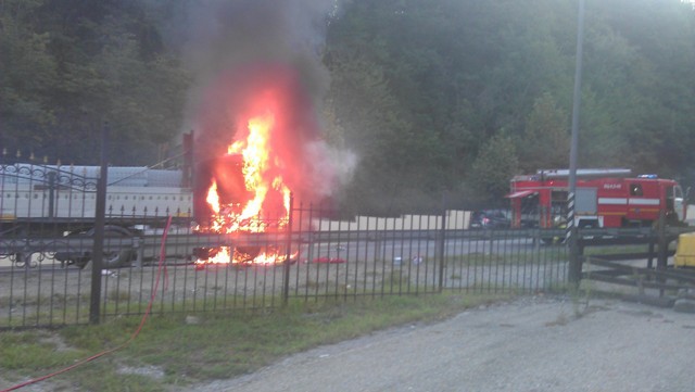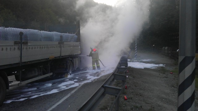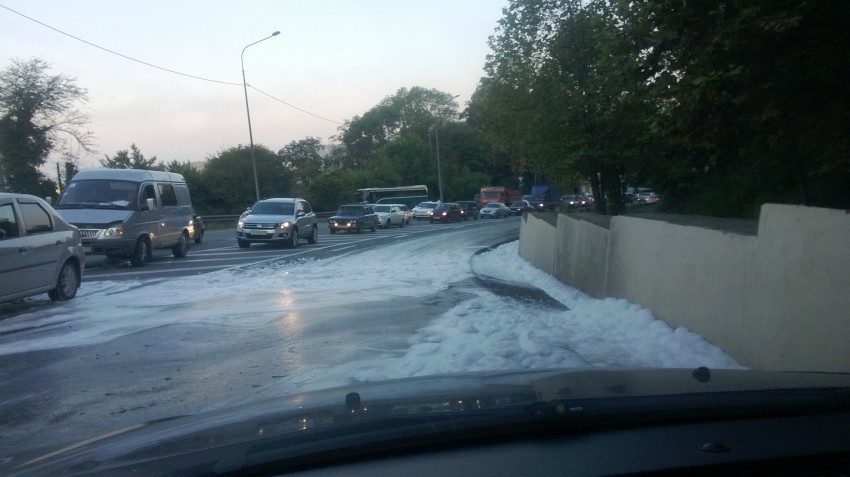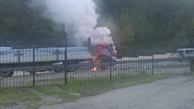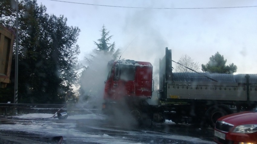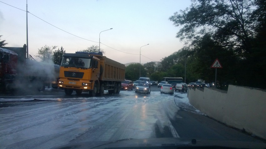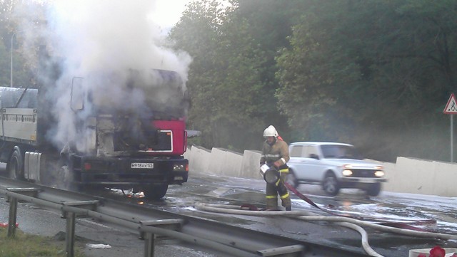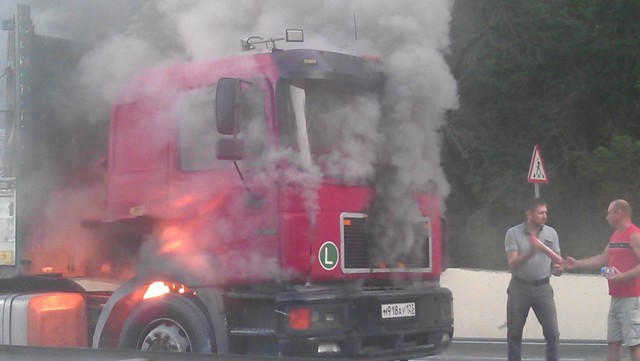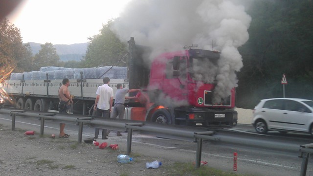 На сужении дороги в сторону перевала в районе Шаумяновки пылает тягач!!!