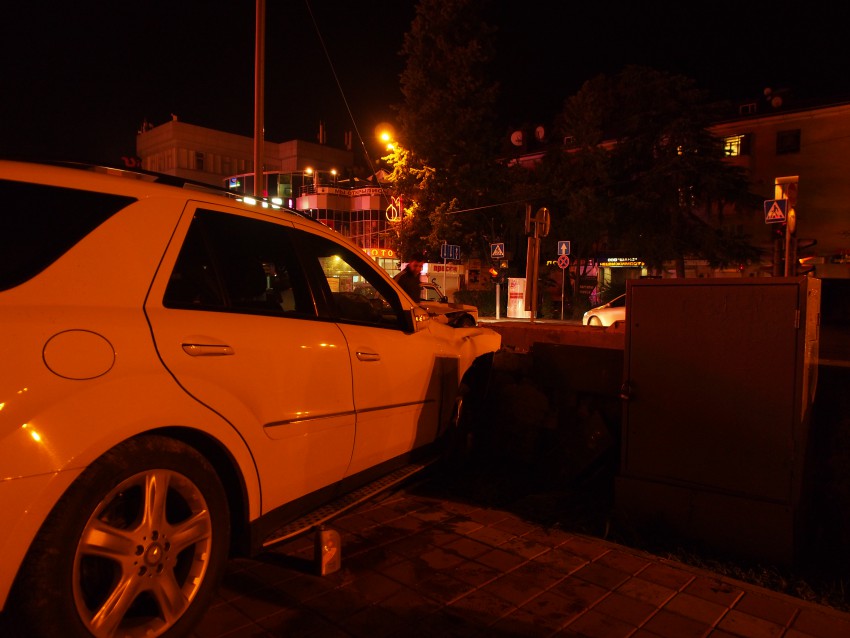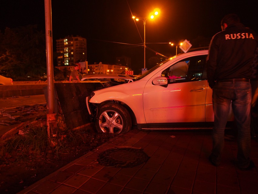 Автомобиль MB ML350 с номерами региона 15, двигаясь на большой скорости по ул. Конституция на повороте у перекрестка не справился с управлением и вылетел через газон в стену около пешеходного перехода. За рулем находилась девушка (сам не видел, хотя прибежал через 6-7 минут после аварии спасать людей, так как звук столкновения был страшный, но очевидцы сказали, что за рулем была девушка, которую я уже не увидел). К счастью никто не пострадал (кроме стенки), не смотря на сильные повреждения авто.