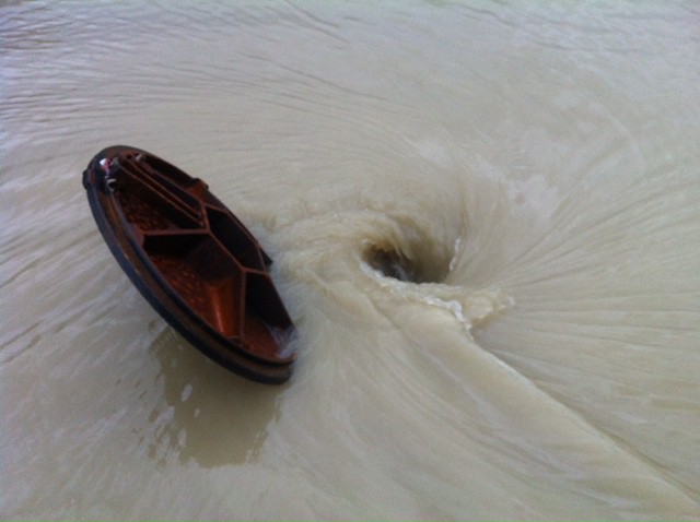 слева в круге бурлит вода из люка, не от дождя выпавшего с неба озеро образовалось, а из ливнёвки выдавило наружу излишек паводка сюда внизину, справа другой люк открыт, но через него не утекает, забит и полно воды…