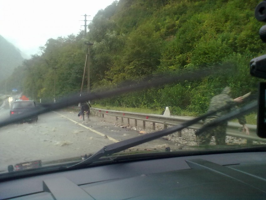 Хотел прорваться на новую дорогу с Красной поляны, добрые люди подсказали, что местами размыло и подмыло, и можно провалиться вот так-то.( какой дурак додумался проложить дорогу почти по устью горной реки)