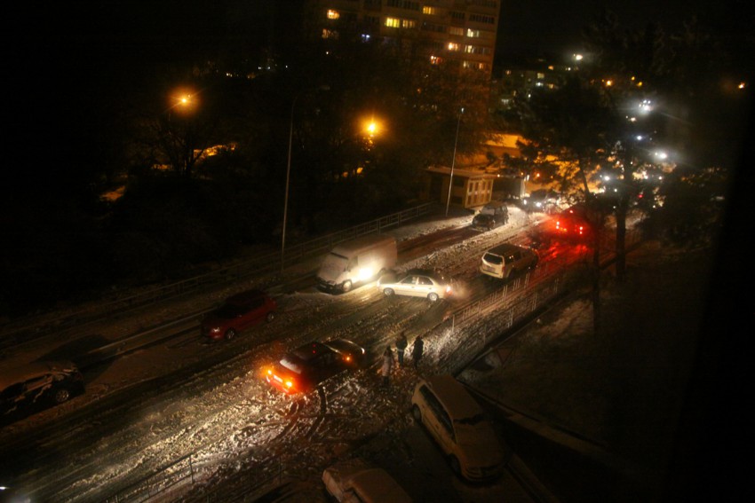 Вообще, «хорошо задумано»: поток машин сверху от школы не может остановиться на крутом снежном склоне, несется на поток машин поднимающихся вверх к перекрестку на Ясногорской 15